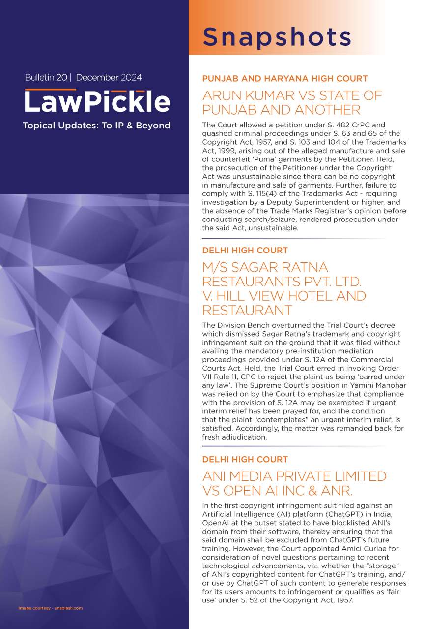Bulletin 20 | Dec 2024 Snapshots PUNJAB AND HARYANA HIGH COURT ARUN KUMAR VS STATE OF PUNJAB AND ANOTHER The Court allowed a petition under S. 482 CrPC and quashed criminal proceedings under S. 63 and 65 of the Copyright Act, 1957, and S. 103…